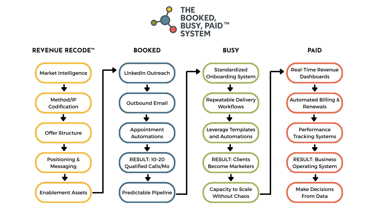 You're overbooked, underpaid, and one bad month away from panic mode. It's time to build a revenue engine that books clients, delivers results, and puts cash in the bank predictably.